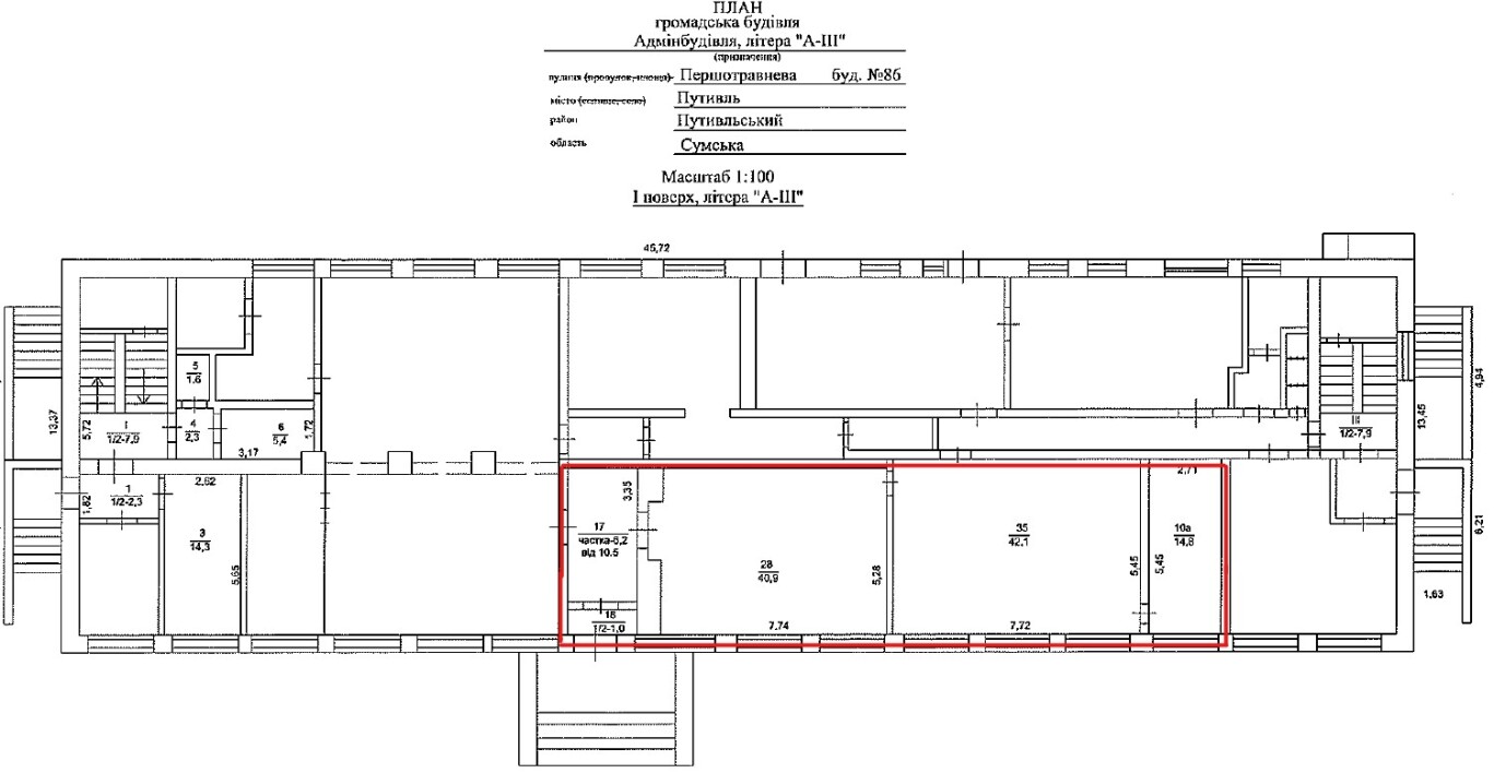 Сумська обл., м. Путивль, вул. Першотравнева, буд. 86. Оренда – офісні приміщення 1-го поверху площею 109,30 кв.м. (В)