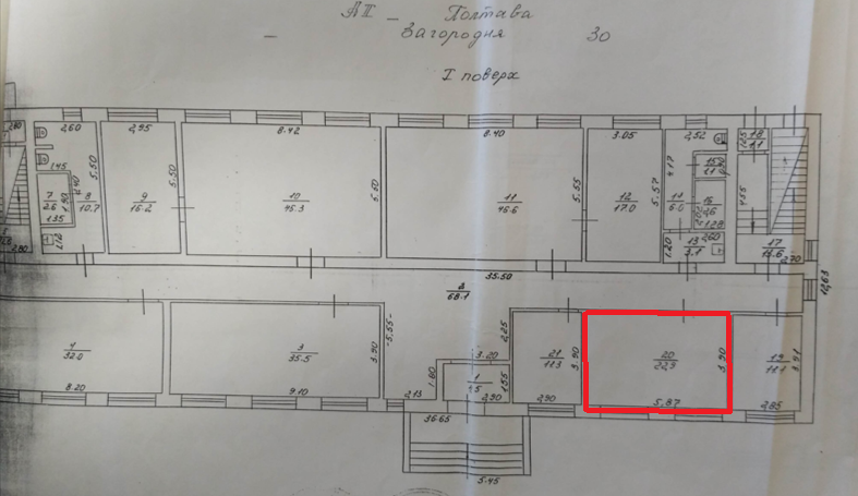 Полтавська обл., м. Полтава, вул. Загородня, буд.30. Оренда – приміщення на 1-му поверсі площею 22,90 кв.м.(В)