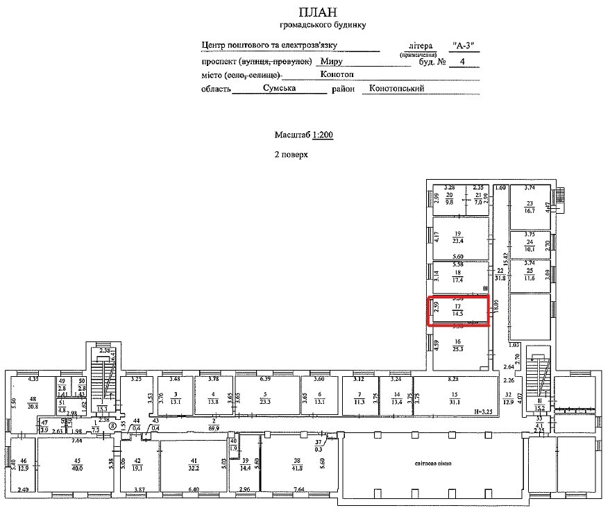 Сумська обл., м. Конотоп, пл. Миру, буд. 4. Оренда – приміщення 2-го поверху площею 14,50 кв.м. (В)