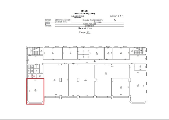 Волинська обл., м. Любомль, вул. Б.Хмельницького, 2. Оренда – приміщення 3-го поверху адмінбудівлі площею 44,80 кв.м. (В)