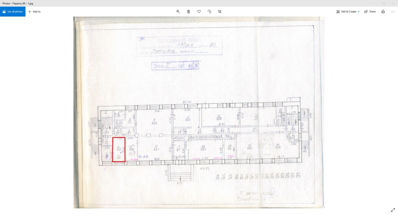 Сумська обл., м. Путивль, вул. Першотравнева, буд. 86. Оренда – офісні приміщення 1-го поверху площею 14,80 кв.м. (В)