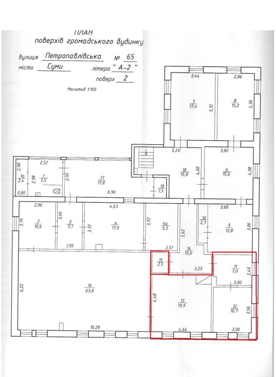 Сумська обл., м. Суми, вул. Петропавлівська, буд. 65. Оренда – офісні приміщення 2-го поверху площею 40,10 кв.м. (В)