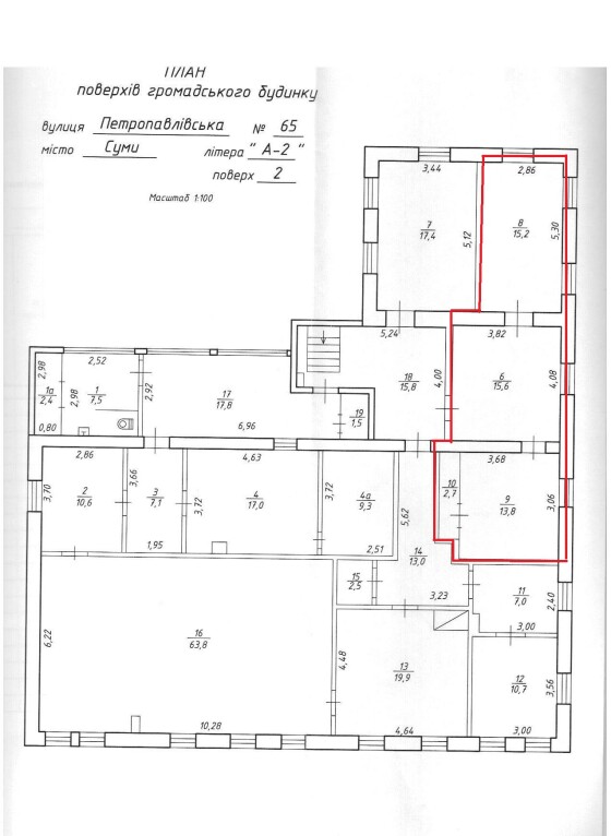 Сумська обл., м. Суми, вул. Петропавлівська, буд. 65. Оренда – офісні приміщення 2-го поверху площею 47,30 кв. м. (П)