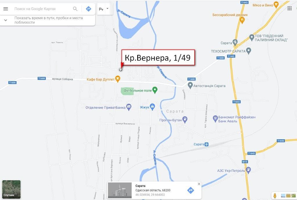 Україна, Одеська обл., Білгород-Дністровський р-н., смт. Сарата, вул. Кр. Вернера, буд.№1/49 А