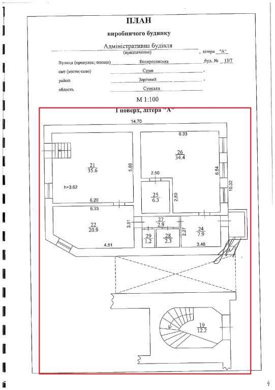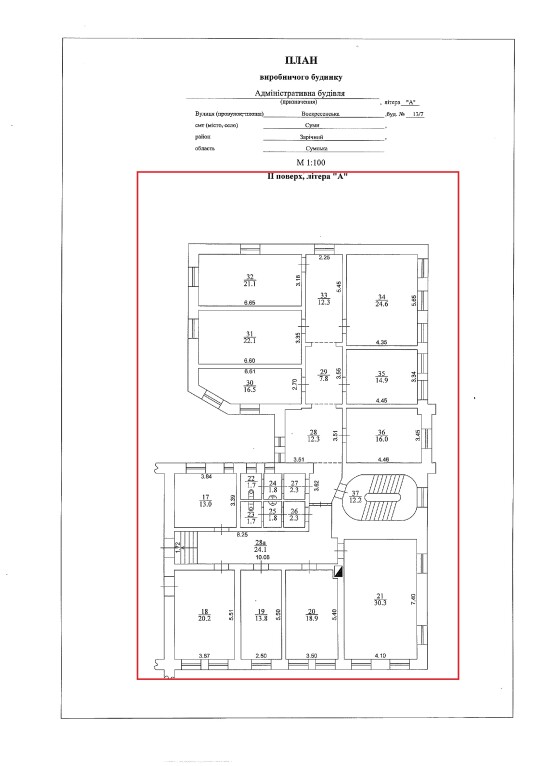 Сумська обл., м. Суми, вул. Воскресенська, буд. 13/7. Оренда – офісні приміщення 1 та 2-го поверхів площею 415,40 кв. м. (П)