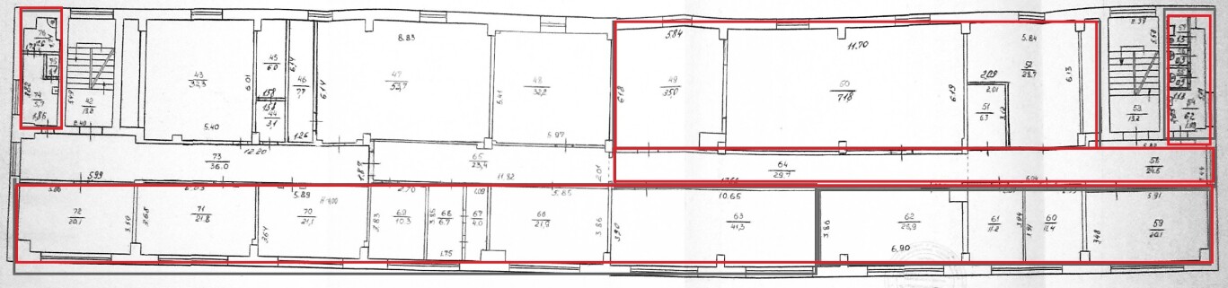 Пропонуються до оренди приміщення 5-го поверху загальною площею 703 м. кв. Будівля знаходиться в центральній частині міста. Розвинена інфраструктура, досить високі автомобільний та пішохідний потоки. Поряд стоянка для автомобілів . Приміщення потребують ремонту та реконструкції електромережі. Характеристики: Кількість поверхів – 6 ; Загальна площа – 4535,1 м. кв ; Площа, запропонована до оренди – 703 м.кв. ; Опалення – централізоване; • Земельна ділянка - площа 0,3639 га. (договір оренди)