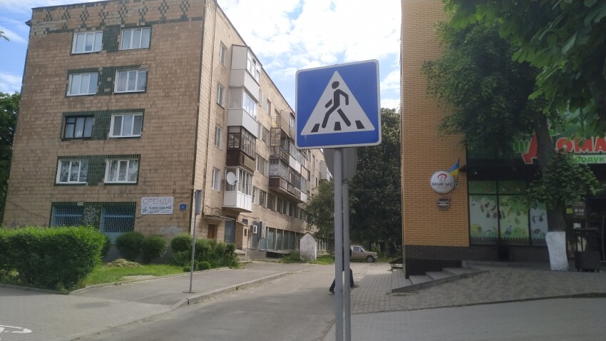 Будівля розташована поряд з пішохідною зоною та проїжджою частиною у