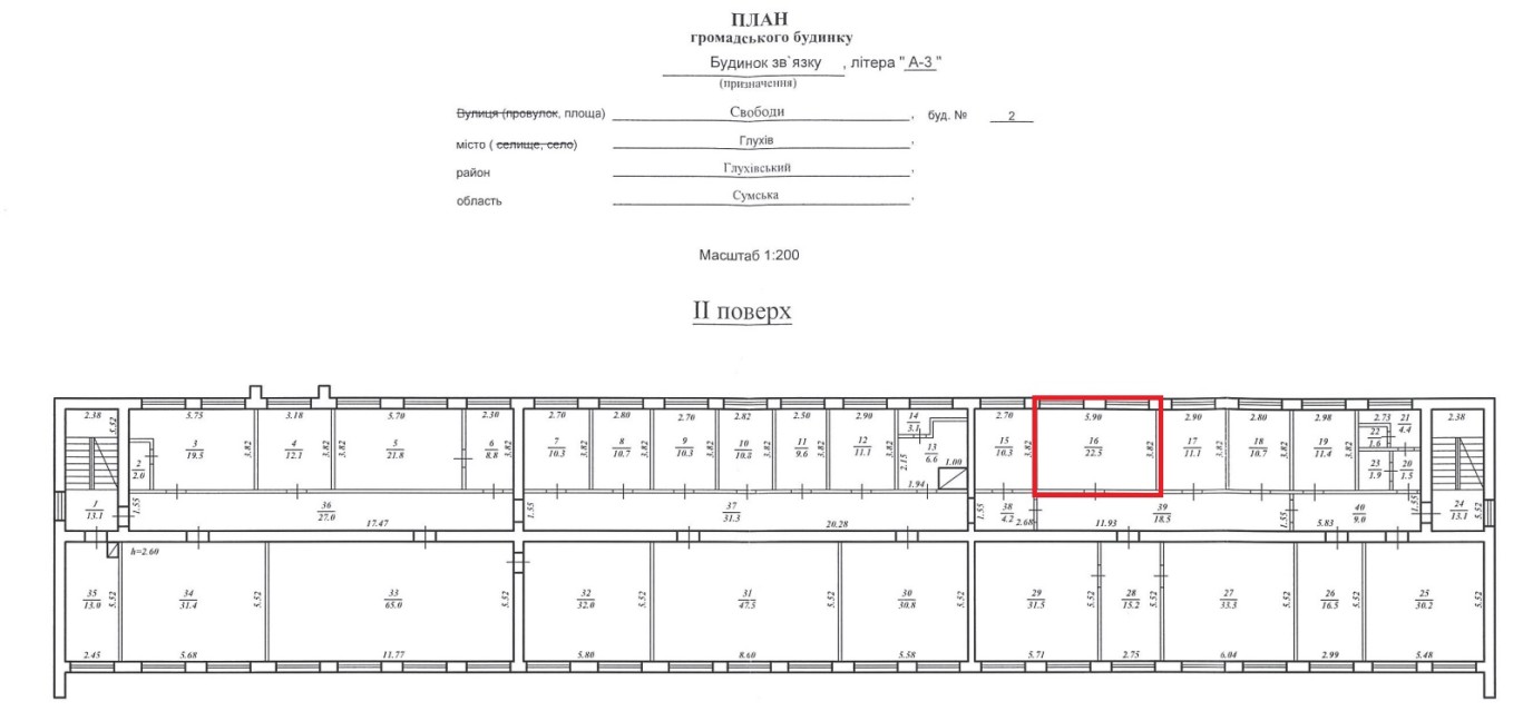 Сумська область, Шосткинський р-н, м. Глухів, пл. Свободи, буд. 2. Оренда – офісне приміщення 2-го поверху площею 22,50 кв.м. (В)