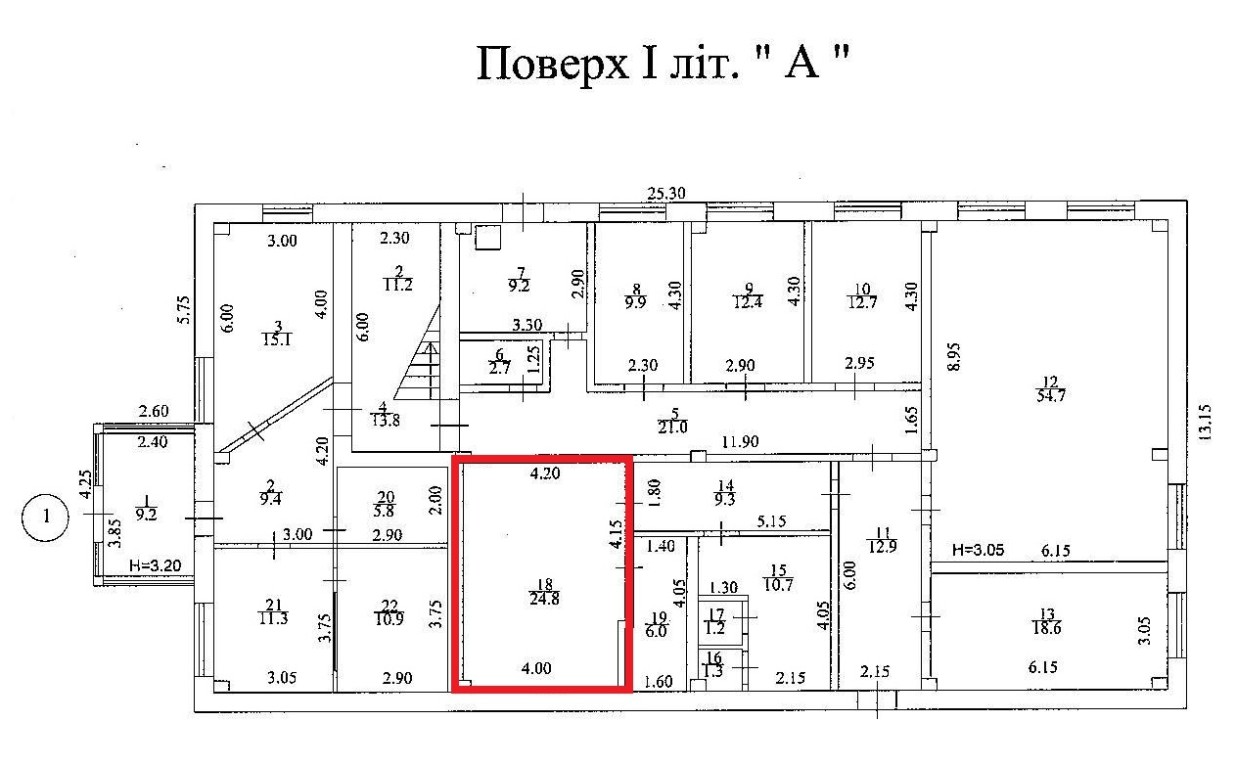 Пропонується до оренди приміщення 1-го поверху площею 24,80 кв. м. Приміщення під офіс, склад, майстерню, потребує косметичного ремонту. Об'єкт знаходиться у промисловій зоні північної частині міста. Приміщення забезпечені електропостачанням,  теплопостачання відсутнє, загальний санвузол на 1-му поверсі 2-поверхової адміністративної будівлі. Висота приміщення Н=3,05 м.