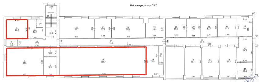 Київськаобл., Обухівськийр-н, м. Обухів, вул. Малишка, 2, літ. «А». Оренда–група приміщеньна 2-му поверсі,загальною площею–178,40кв.м(В)